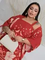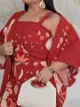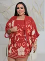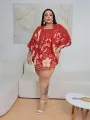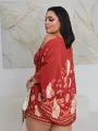 Macacão curto com alças largas e decote quadrado, em estampa floral quente de vermelho, creme e coral. O caimento é suave e a cintura marcada realça a silhueta, mantendo o conforto para o dia a dia.