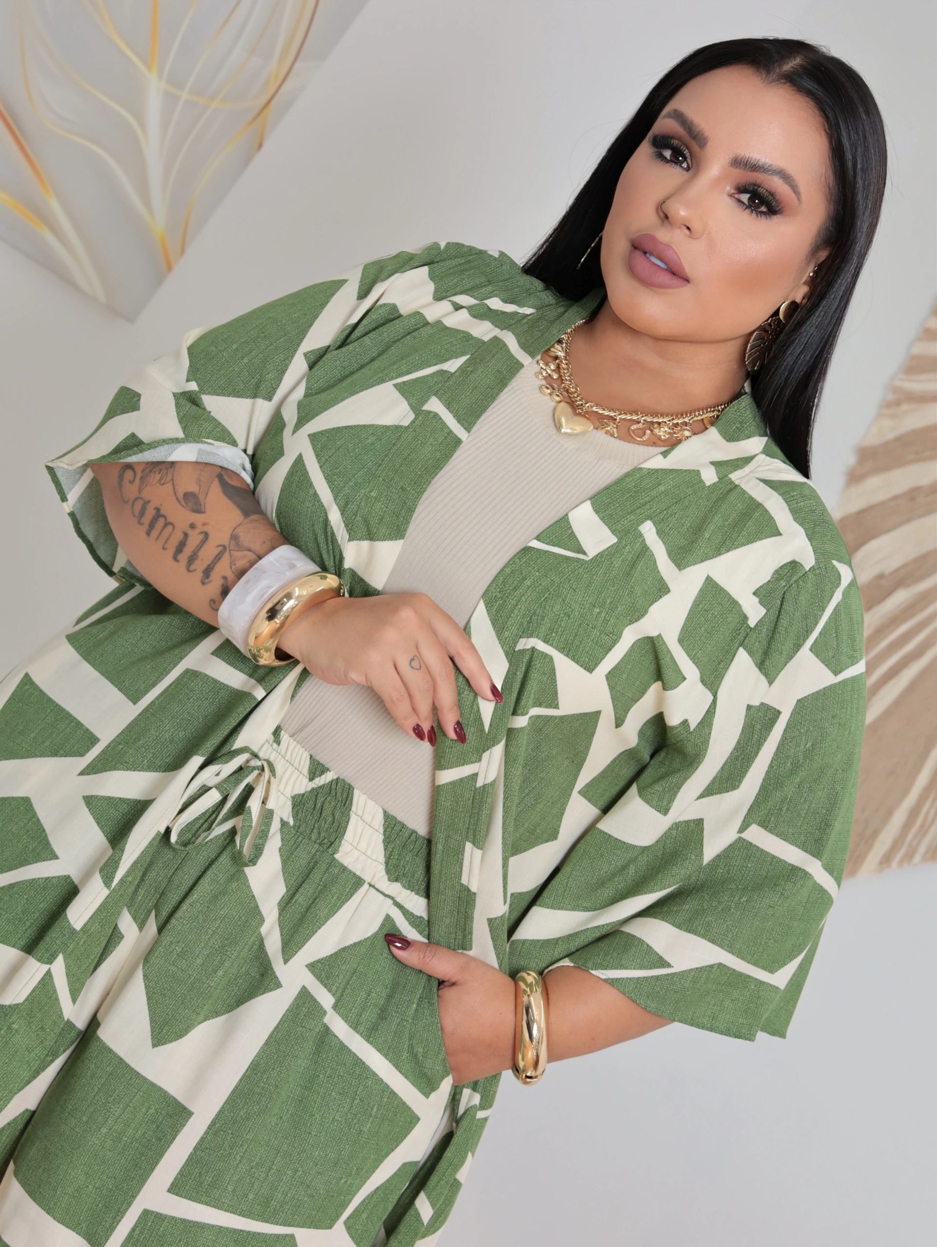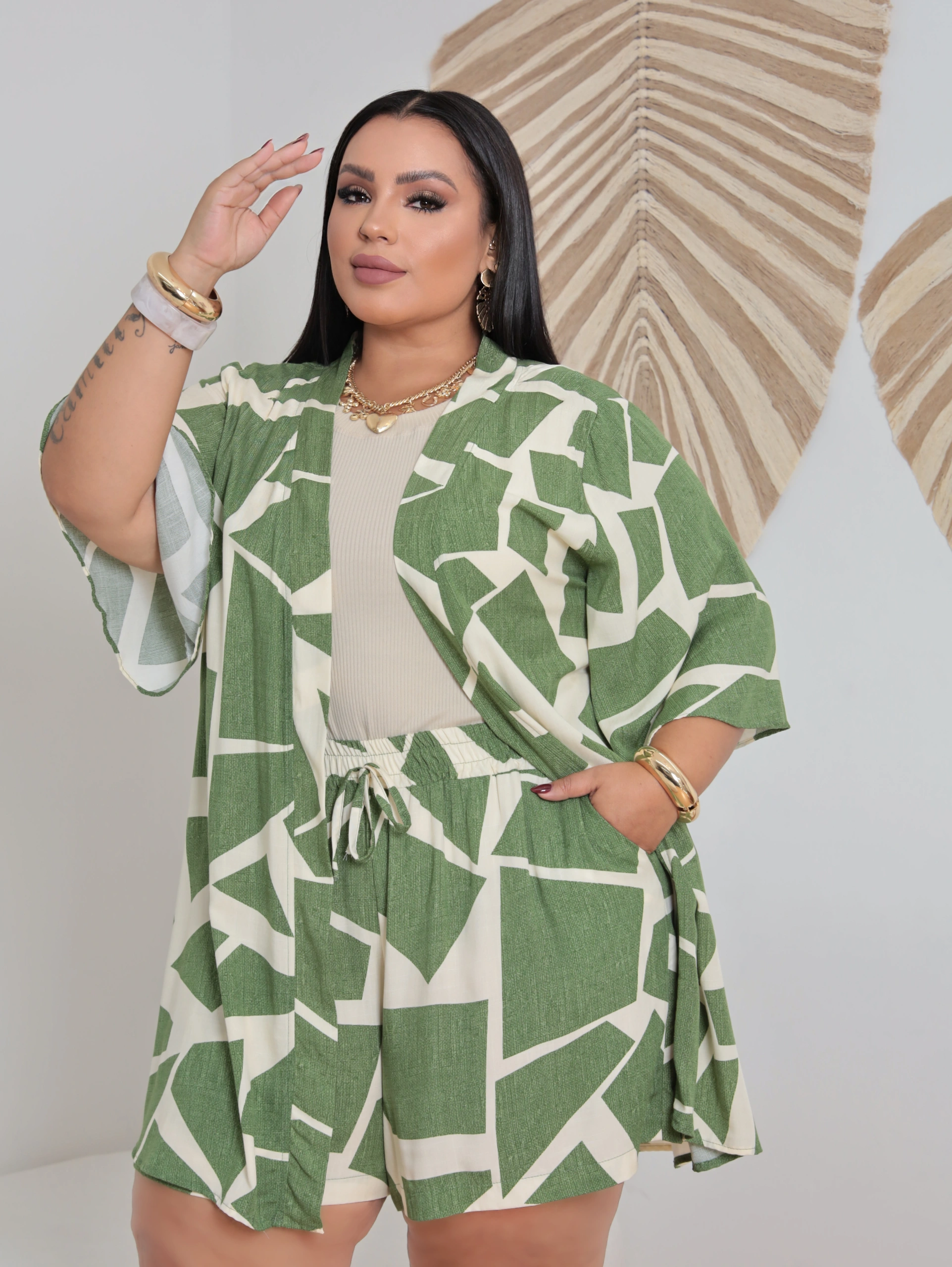 Conjunto kimono plus,em tecido viscolinho.