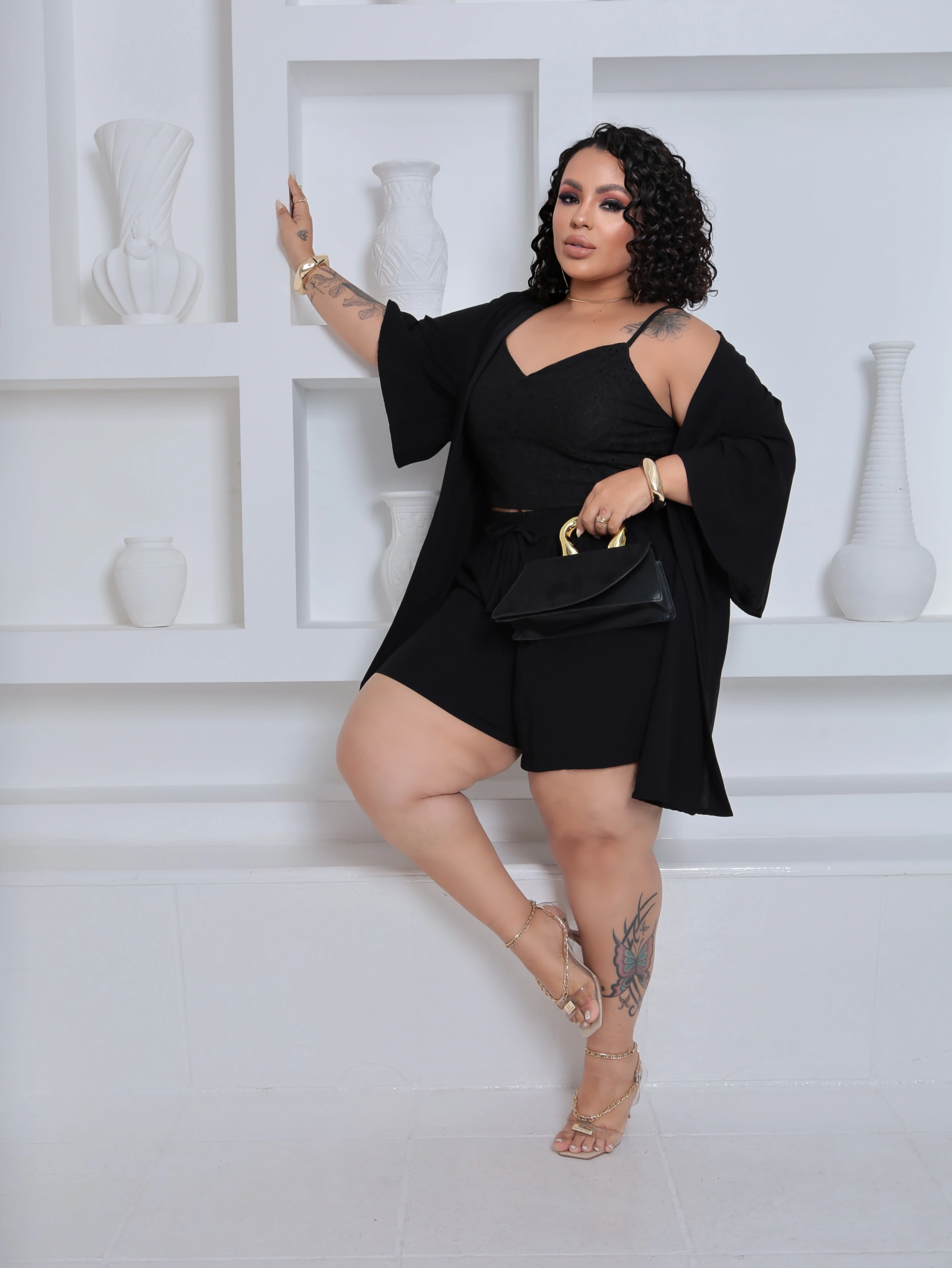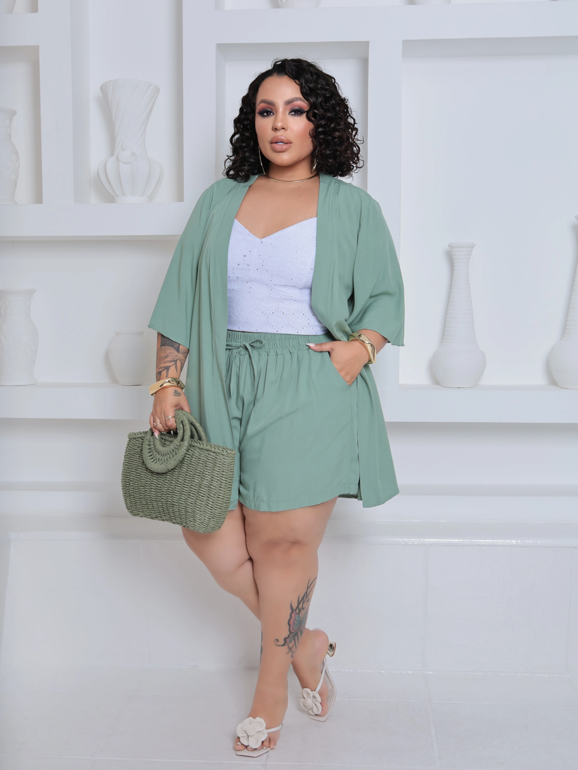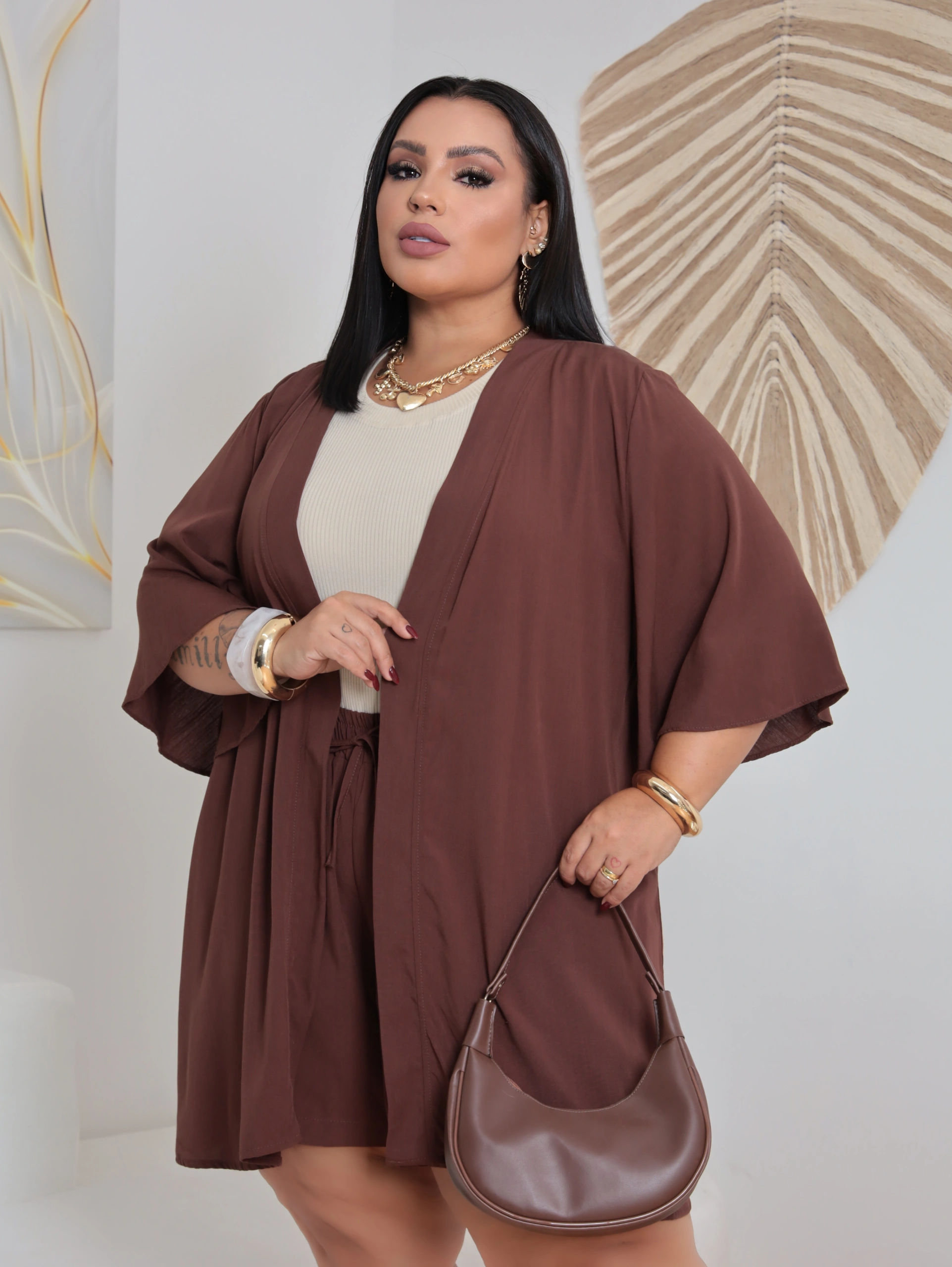 O Viscolinho oferece um caimento leve e soltinho. Como o Kimono é uma peça aberta (estilo oversized), ele se adapta facilmente a diferentes medidas de busto.