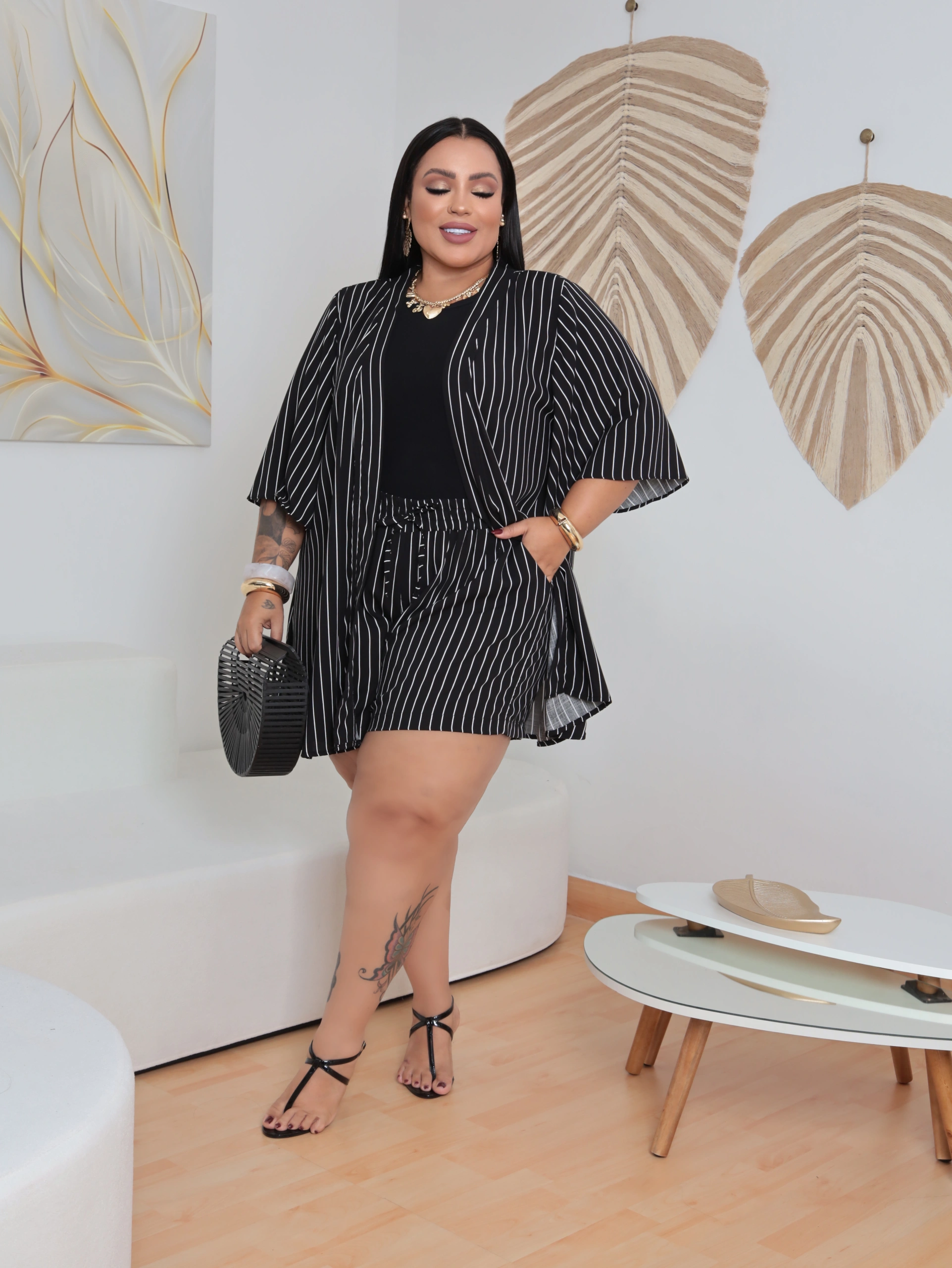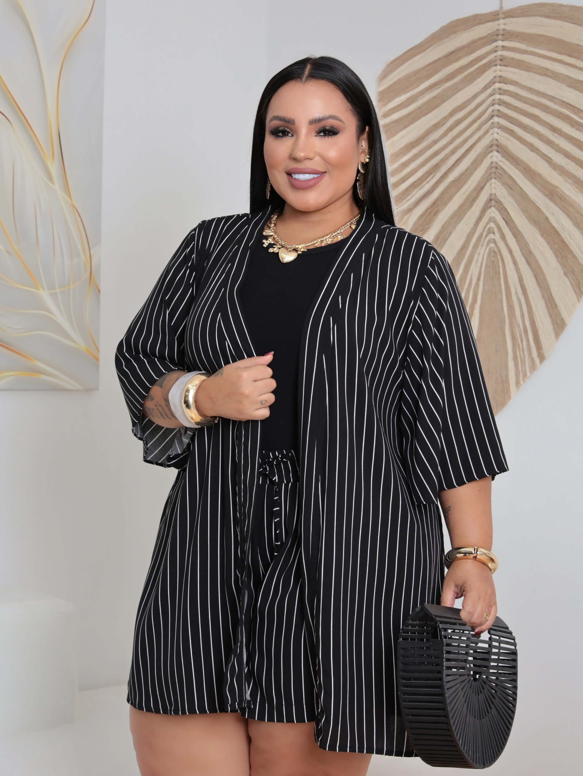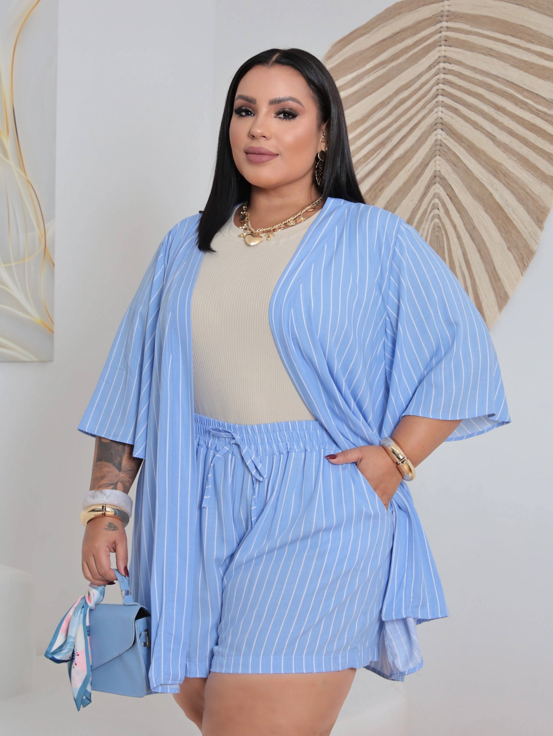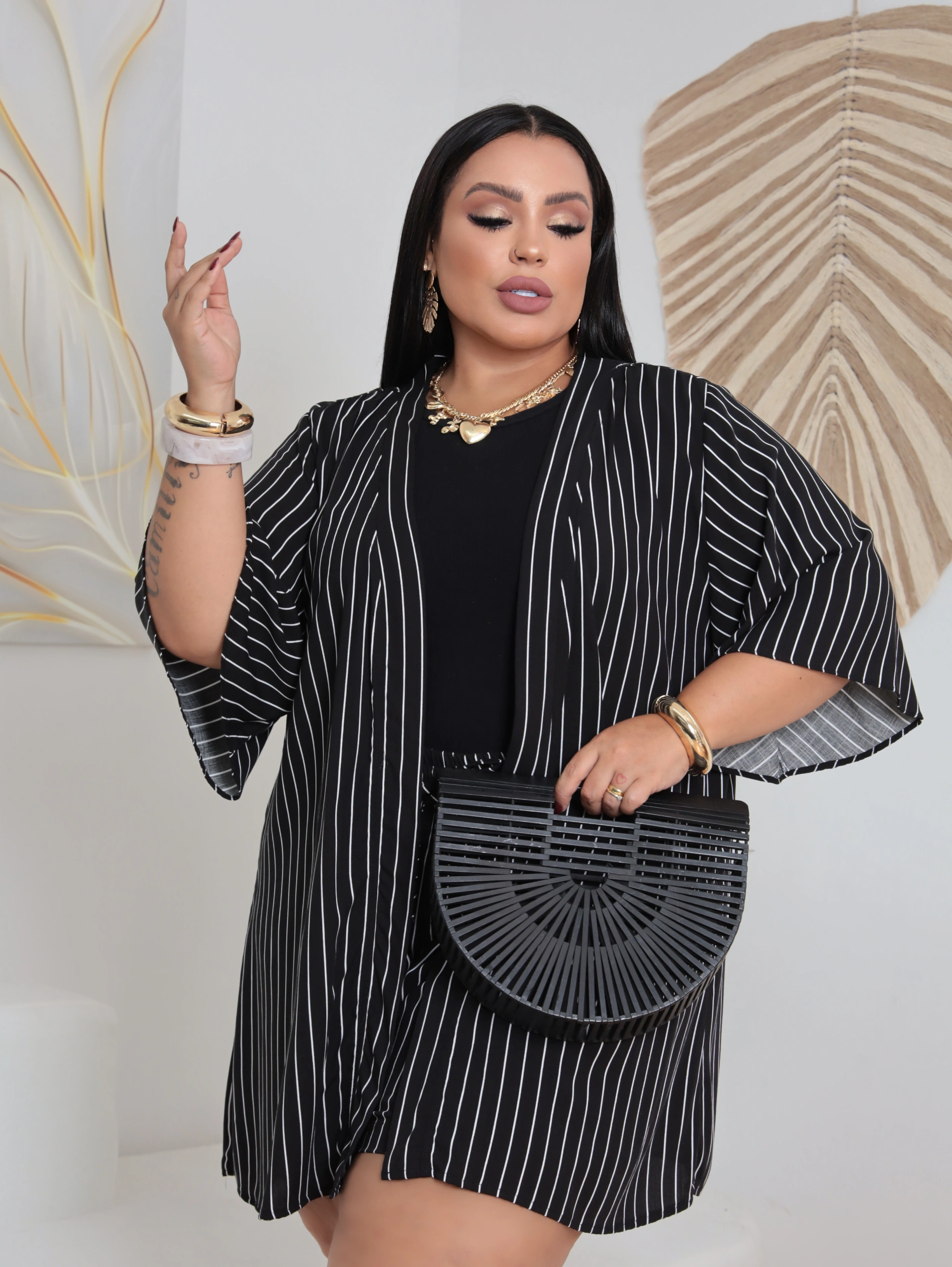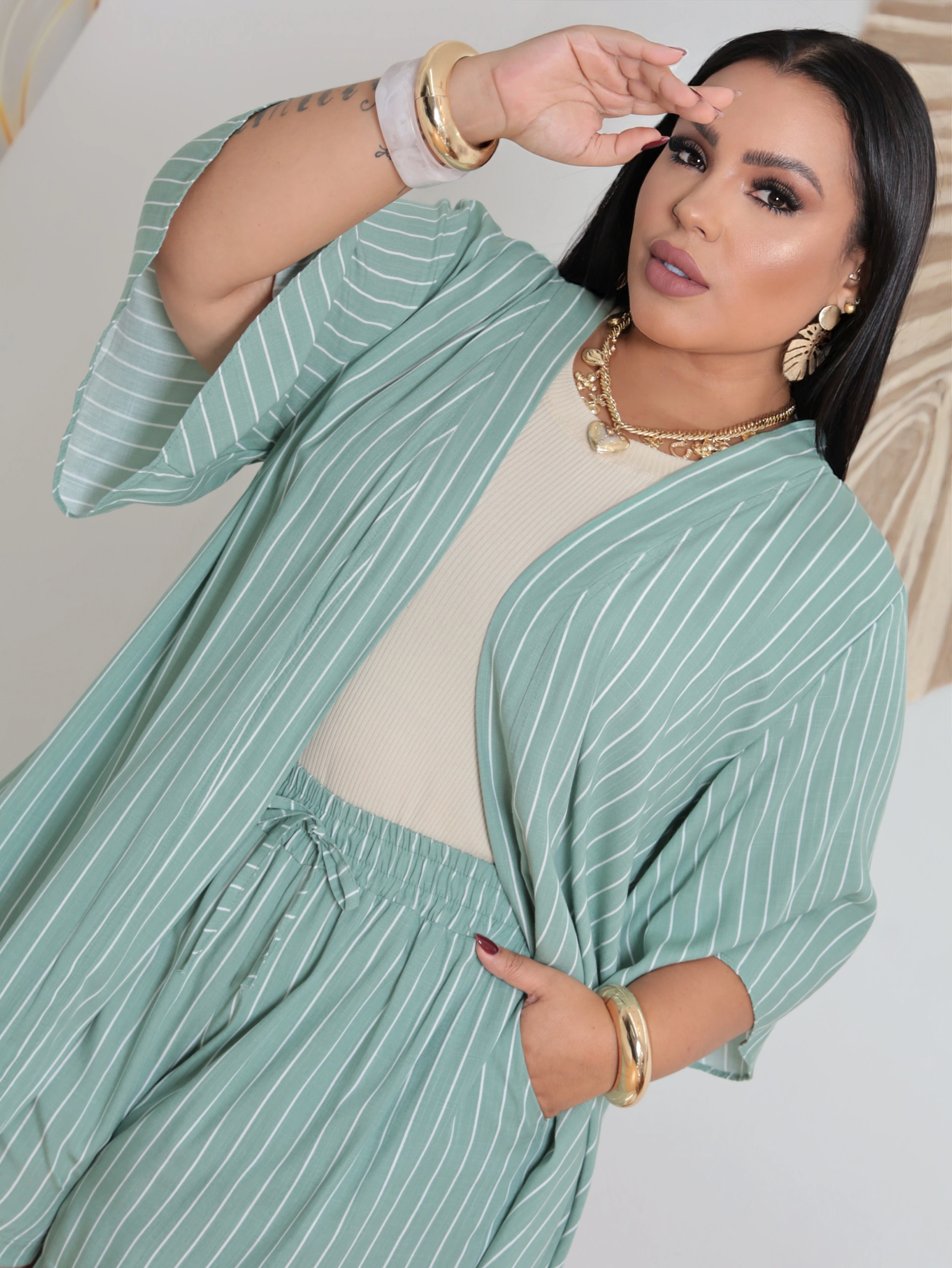 Conjunto kimono plus listrado,em tecido viscolinho.